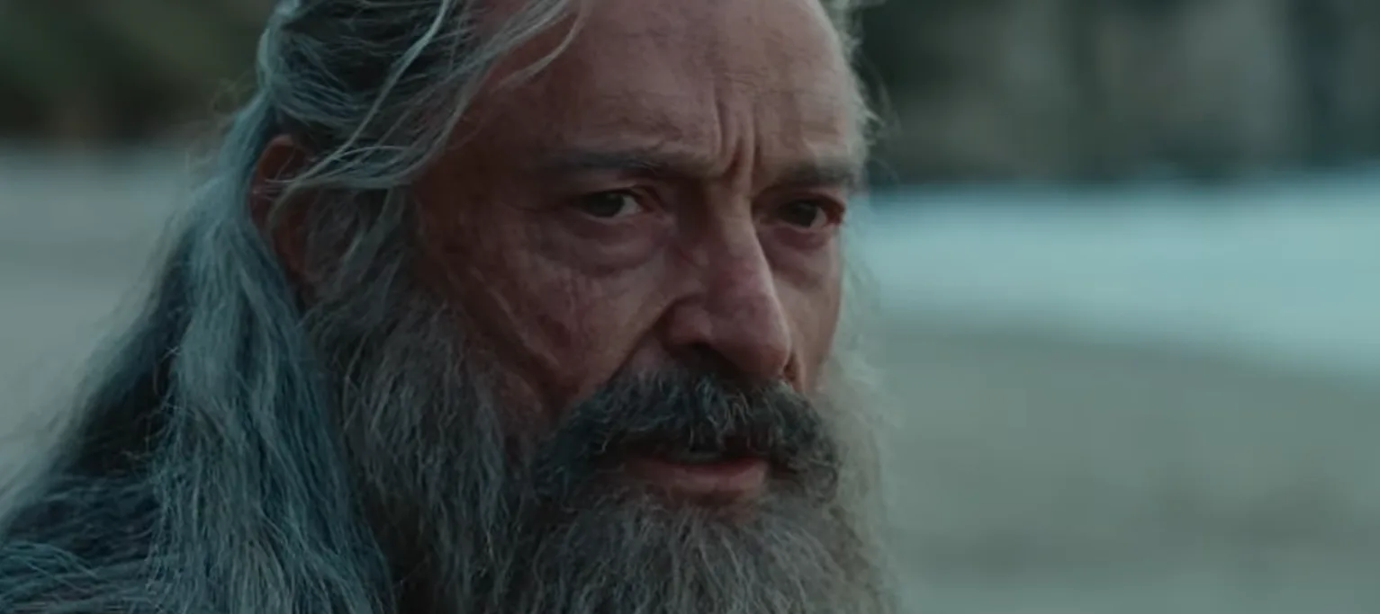In a new trailer, Hugh looks worlds away from his suave red carpet appearances with long, silver locks and a bushy beard.