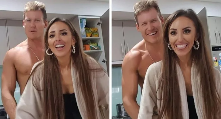 In one snap, Seb stood behind Elizabeth as she leaned against the kitchen counter with a big smile on her face. Another showed the ex-footy player with his arms around his partner’s waist while she bit her tongue flirtatiously.
