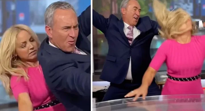 The video, posted to Instagram, shows Monique flipping her hair in circles while holding onto The Sunrise desk with two hands, and Mark moving side to side with his arms in the air before they both start lassoing motions.