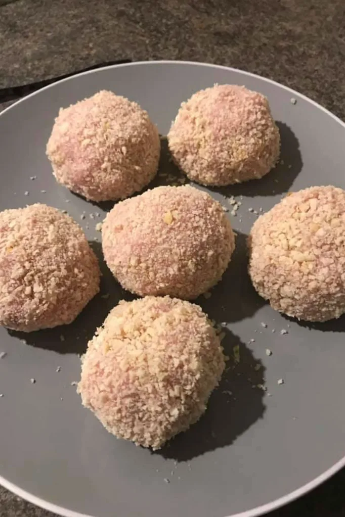 She writes: ‘Chicken mini Kiev’s with salad. Defs be making some to keep in the freezer.‘500g of chicken mince, pre made garlic butter.Divide the mince into portions (I did 6) flatten the portions out insert a disk of garlic butter and manipulate the mince around the garlic butter to seal it in, roll in panko crumbs or for the ketoers roll in pork crackle crumb.Place into pm [Pie Maker] (no oil) and cook for about 5 minutes then flip over until golden brown.’Ellisa places a knob of garlic butter inside some chicken mince and then rolls them in Panko … (Image: Kmart Pie Maker Recipes, Tips and Ideas Australia/Facebook)… before placing them in the Pie Maker …. (Image: Kmart Pie Maker Recipes, Tips and Ideas Australia/Facebook)