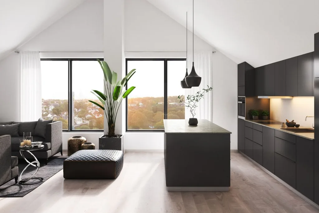 Use wide expansive windows to bring the outdoors inside, with plenty of natural light and finish it all off with cool black cabinetry.