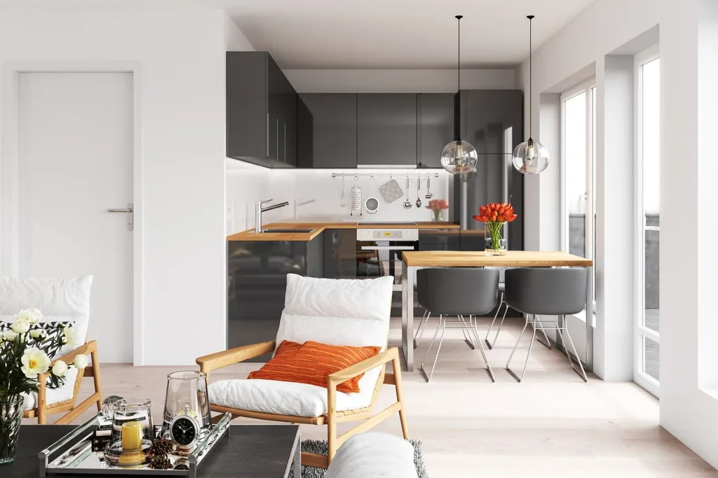 Use pendant lights and an island benchtop to give your kitchen an instant update without having to change the cabinetry.