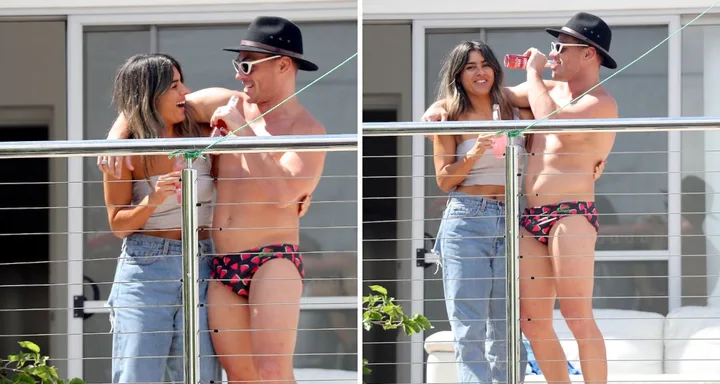 In exclusive pictures obtained by New Idea, the 25-year-old Bachelorette star is seen partying it up in a pair of budgie smugglers, alongside ex-contestant Ciarran Stott and a stunning mystery lady.
