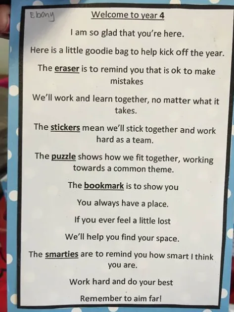 A teacher in Queensland has welcomed her new class with a special poem and a goodie bag.
