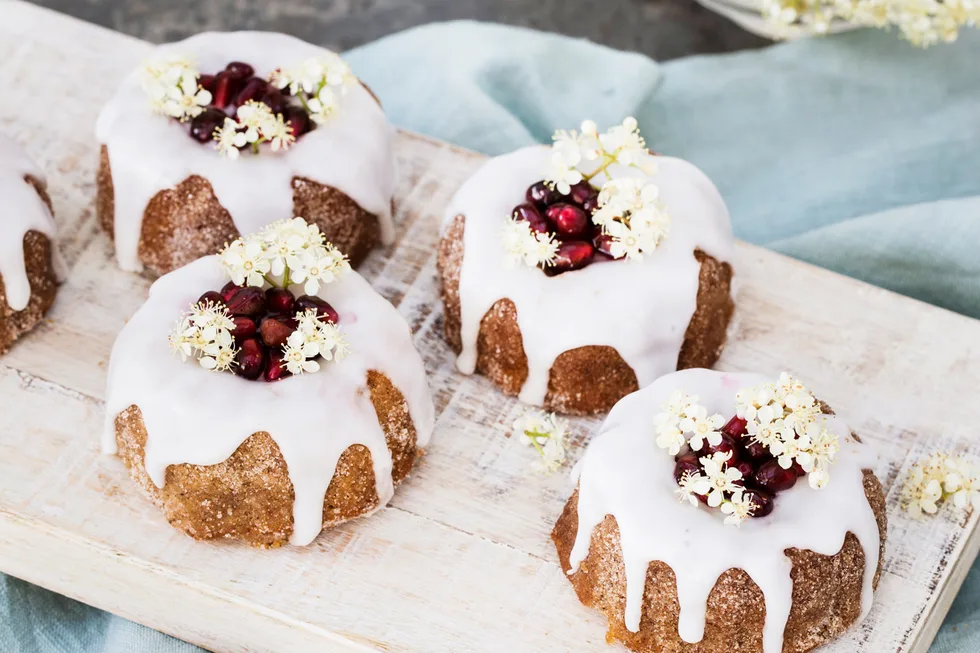 5. To make the icing, sift icing sugar into a bowl, add enough water to make a thick icing and stir until smooth. Spoon icing on top of each cake. Allow to set. Garnish with pomegranate and flowers. Serve.