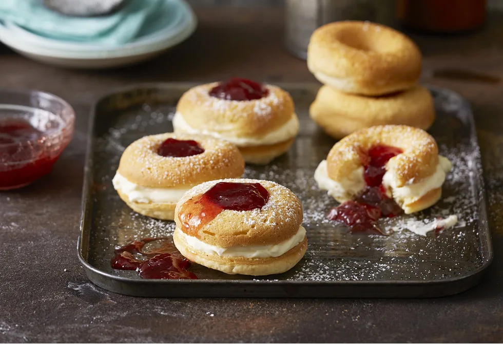 5.Slice warm scones in half horizontally, then sandwich together with whipped cream. Fill centres with jam and serve dusted with icing sugar.