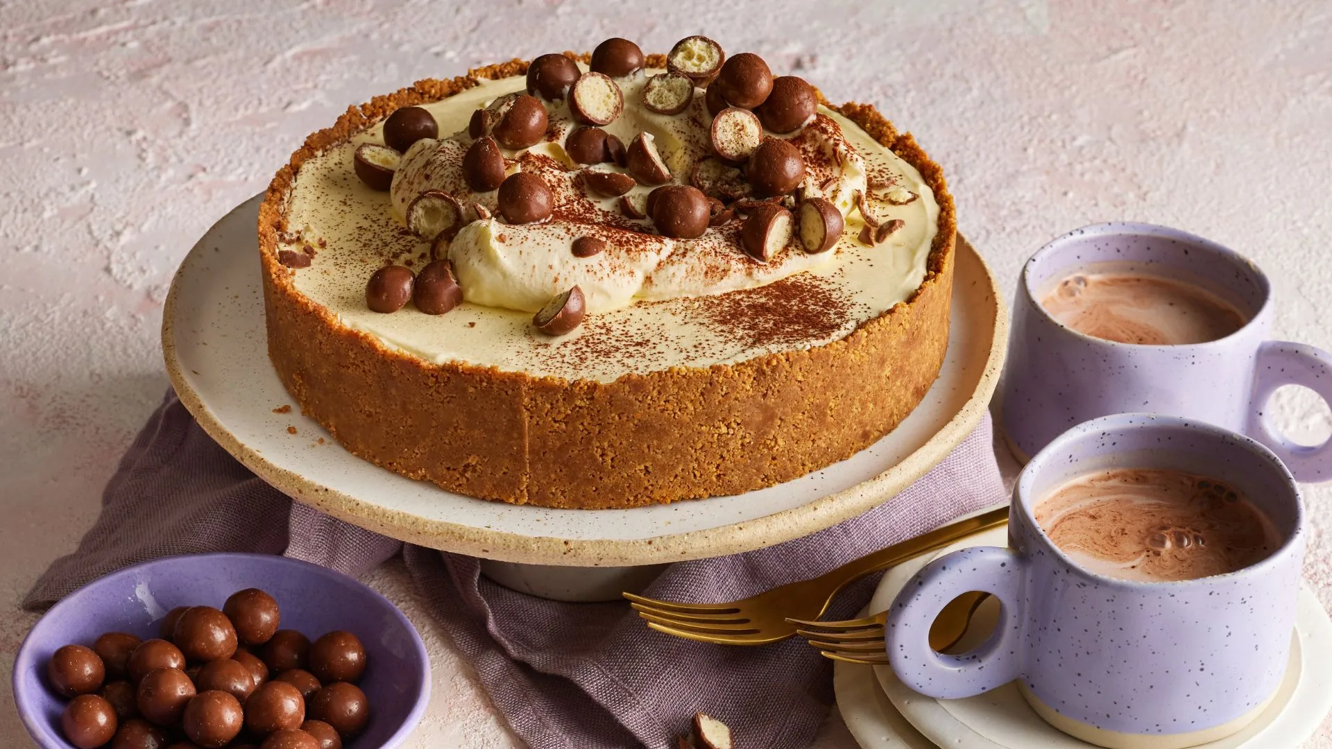 Remove the side of the pan. Transfer the cheesecake to a serving plate. Spoon whipped cream over top. Sprinkle with remaining chopped and whole Maltesers. Dust with cocoa.