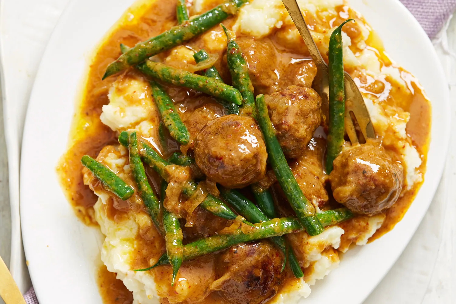 4 Return meatballs to pan with milk, beans, water, sauce and juice. Bring to boil. Simmer, uncovered, stirring occasionally, for 5 minutes until meatballs are cooked and beans are tender.