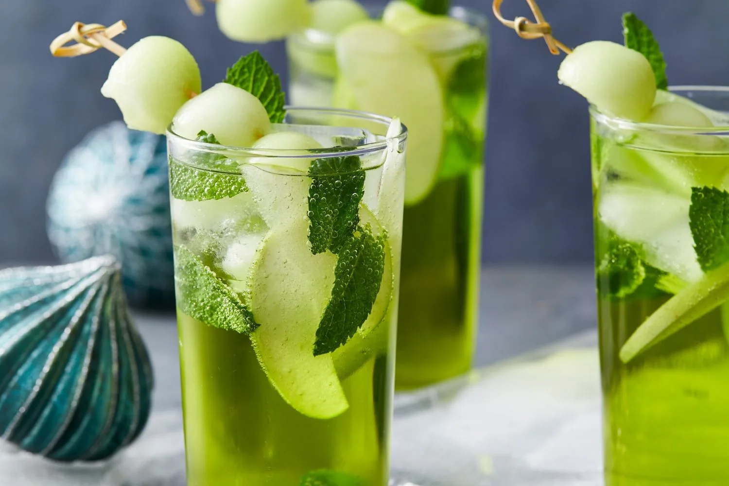 Place 4 ice-cubes in each glass. Pour about ¾ cup Midori mixture into each one. Top up with mineral water or lemonade. Serve with honeydew skewers. Decorate with extra mint.