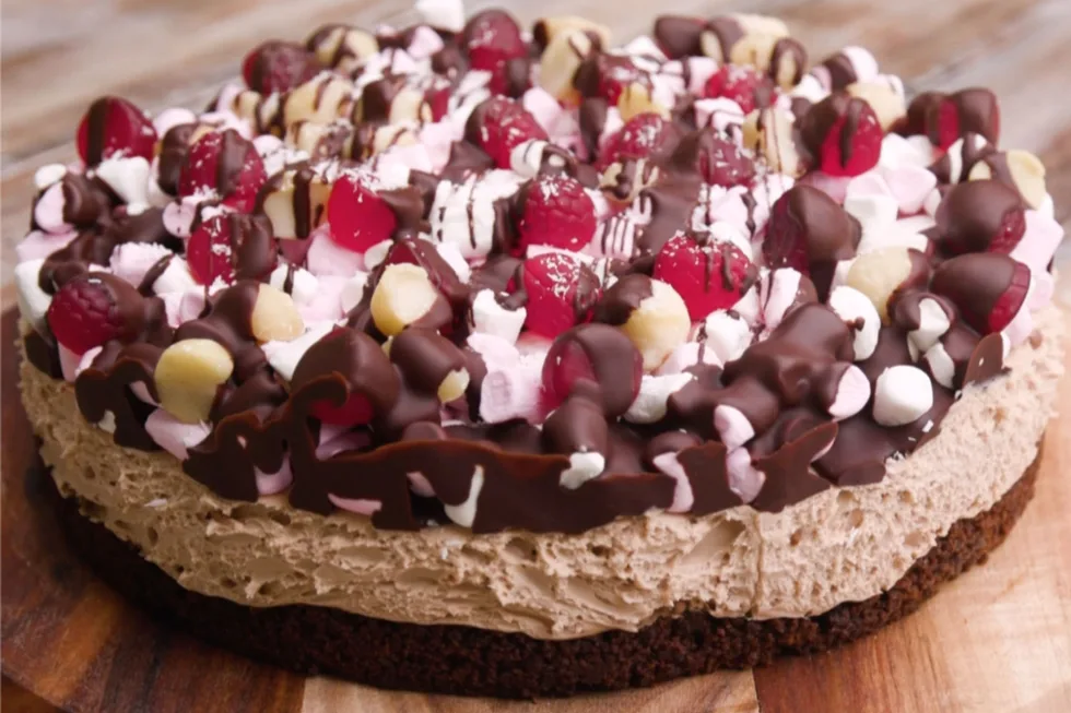 Once set, top with mini marshmallows, then raspberry lollies, nuts and coconut. Then pour melted chocolate over the top and leave until set. Slice and serve.Â
