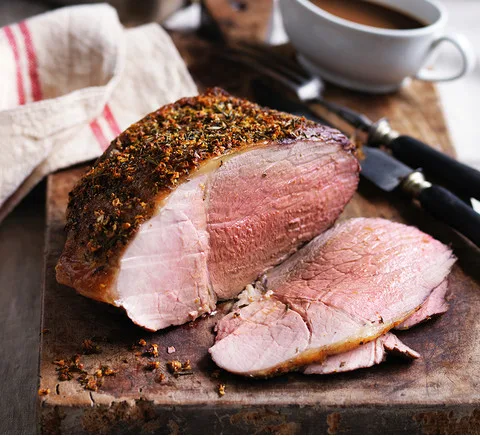 Carve beef across grain. Serve with gravy and roast vegetables