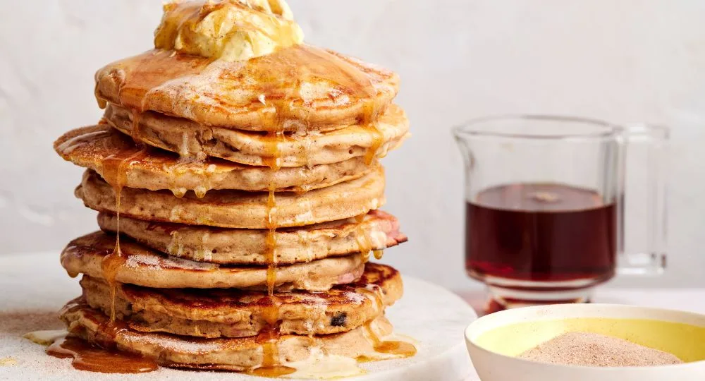 Serve pancakes with whipped butter. Sprinkle with extra cinnamon sugar. Drizzle with maple syrup.