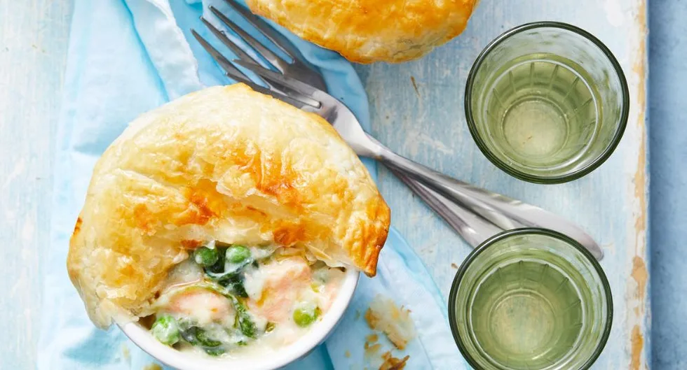Quick fix weeknights – these cheesy salmon pot pies are a scrumptious family pleaser.