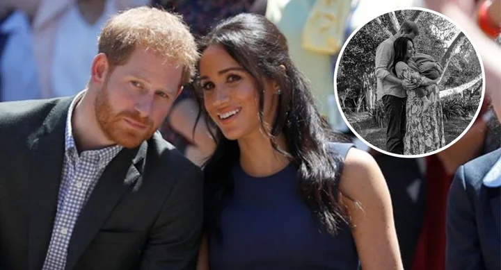 In the beautiful snap, Meghan is seen sporting her baby bump and cradling Archie while Prince Harry holds his wife and looks at his son.