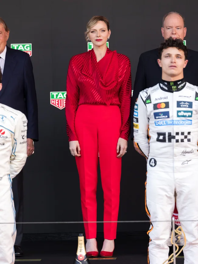 Earlier that same day, Charlene wore a red blouse from the 2025 spring/summer Louis Vuitton collection, alongside matching red cigarette pants, baguette cat-eye sunglasses from Fendi, and a pair of striking Manolo Blahnik BB 70 red suede pumps.